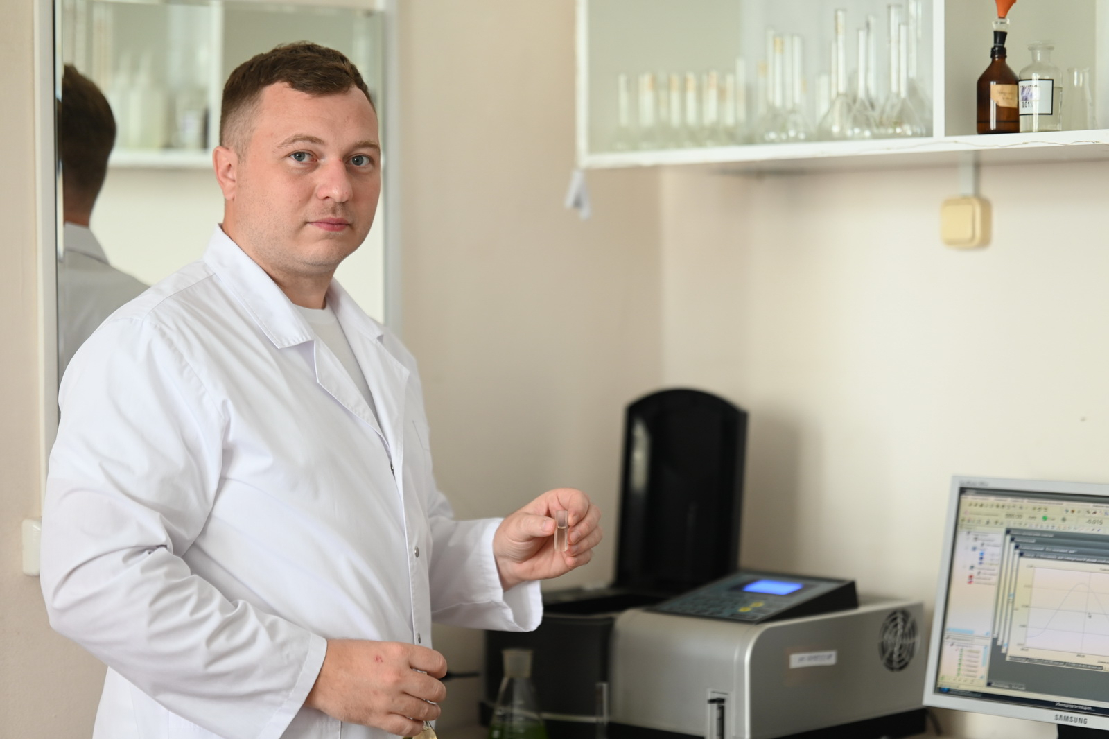 «Потом получившаяся лекарственная форма помещается в специальный прибор — спектрофотометр. С его помощью мы определяем концентрацию веществ в растворе», — рассказал о ходе эксперимента Евгений Курдюков.